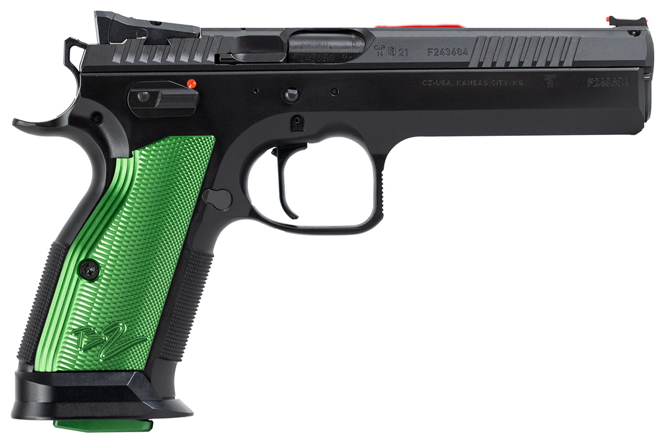 Buy CZ TS 2 9mm Pistol with Black Frame and Racing Green Grips online. The TS2 Green is a development of the new TS2, including many essential characteristics that make it ideal for competition or range use. Visually, this model is distinguished by flat, green anodized aluminum grips and magazines with green anodized bases, while physically, this model is distinguished by a height adjustable rear sight, extended left side safety, thumb rest, flat side stop, adjustable, and green magazine release.
