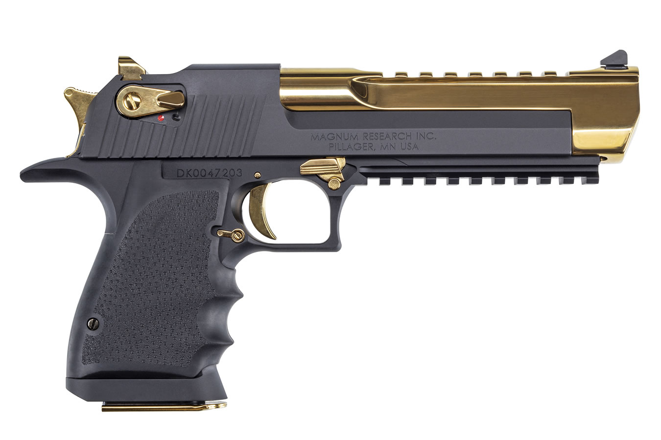(Titanium Gold appointments include safety screws, safety levers, the hammer housing, the hammer, the barrel lock, the pin, the magazine catch, the slide catch, the barrel lock, the magazine catch, the trigger, and the rear sight.) The brilliant contrast between the black and gold finishes creates an eye-catching visual effect while maintaining the high quality and durability that Magnum Research Desert Eagle pistols are known for.
